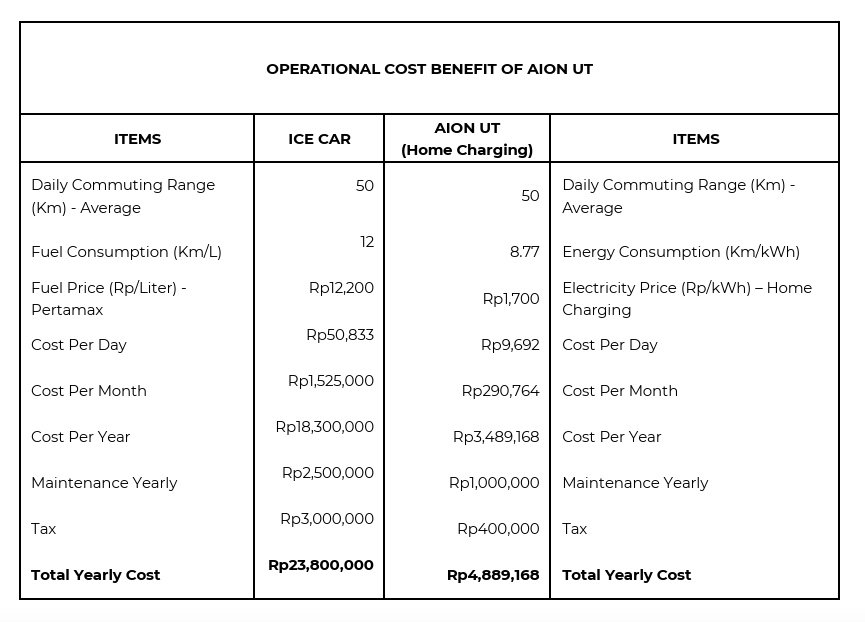 Bagi masyarakat perkotaan, umumnya rata-rata jarak tempuh sekitar 50 kilometer per hari. Tentunya, efisiensi penggunaan energi menjadi faktor penting dalam memilih sebuah kendaraan. Berdasarkan perhitungan, penggunaan AION UT hanya memerlukan biaya sekitar Rp9.690 per hari, atau setara Rp290.760 per bulan.