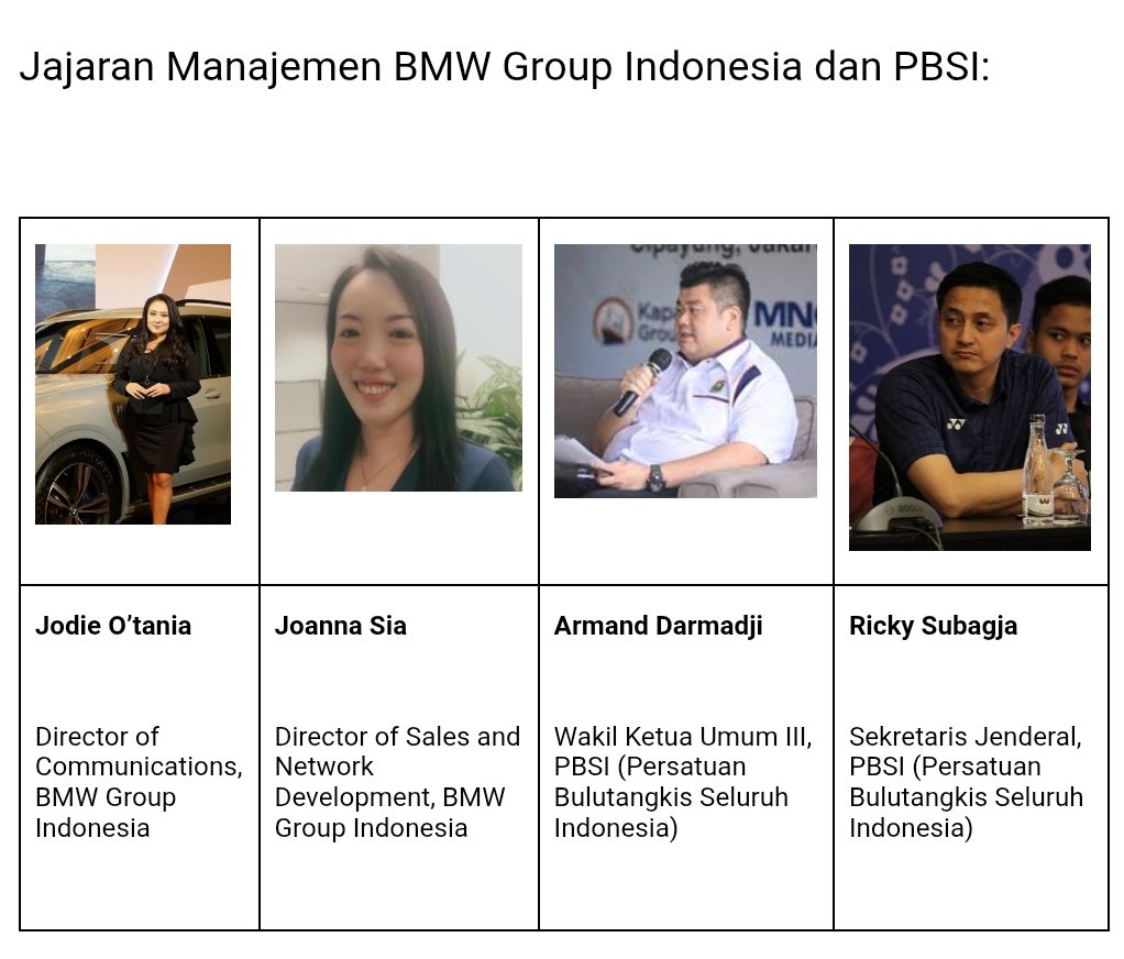 Jodie O’tania, Director of Communications BMW Group Indonesia mengatakan, “BMW bangga dapat terus melanjutkan kolaborasi dengan PBSI sebagai Official Mobility Partner. Sebagai brand otomotif premium yang mengedepankan performa dan presisi, kami melihat semangat olahraga khususnya bulutangkis, sangat cocok dengan nilai-nilai kami. Dukungan terhadap ajang bulutangkis bergengsi seperti Indonesia Open mencerminkan komitmen BMW untuk ikut memajukan olahraga yang telah menjadi bagian dari identitas dan kebanggaan bangsa. Melalui kolaborasi ini, BMW tidak hanya menghadirkan kendaraan premium, tetapi juga berperan dalam menginspirasi prestasi dan semangat kompetisi di tingkat dunia.”
