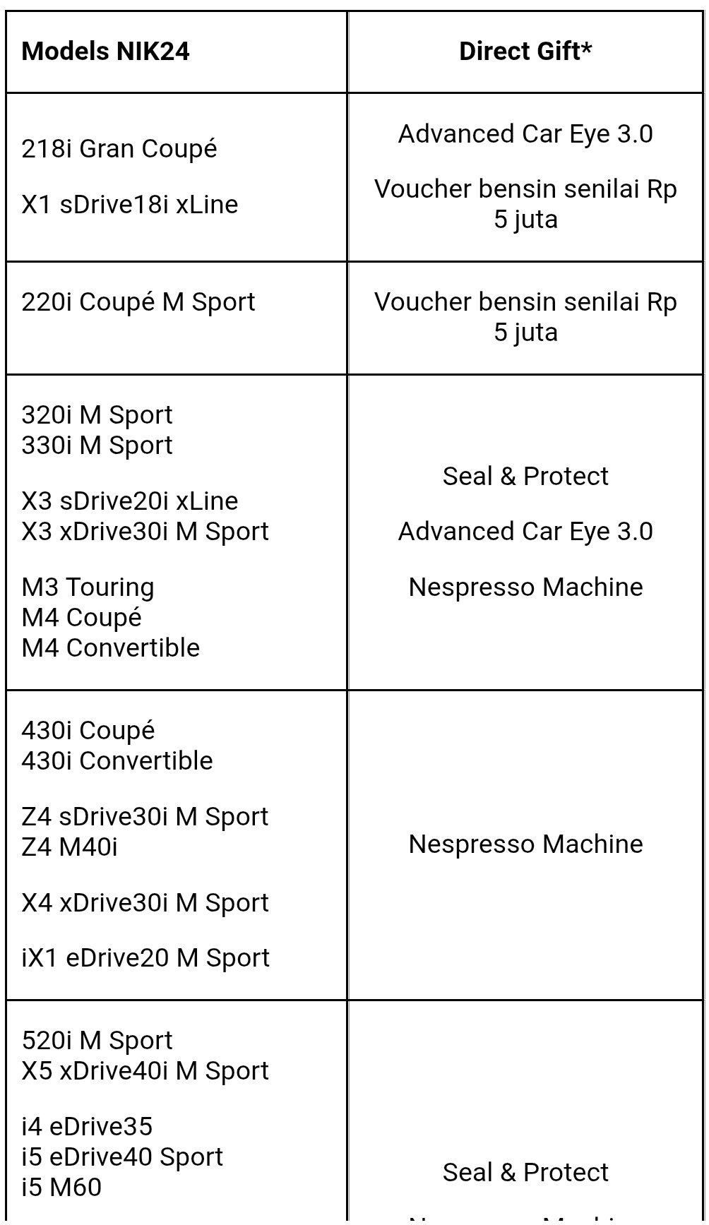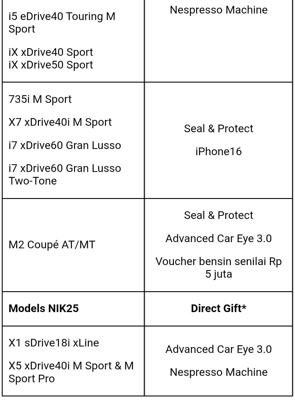 Selama BCA Expo 2025, selain menghadirkan kendaraan-kendaraan terbarunya, BMW Indonesia tawarkan program pembiayaan menarik untuk model-model terbarunya sebagai berikut. Antara lain direct gift luar biasa seperti* iPhone 16, Nespresso Coffee Machine, Voucher Bensin, dengan detail sebagai berikut: