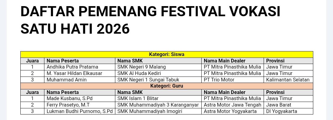 Sebagai bentuk penghargaan atas capaian kompetensi, AHM memberikan apresiasi kepada siswa dan guru terbaik pada FeVoSH 2026 sebagai dukungan nyata terhadap penguatan pendidikan vokasi di SMK. Pada kategori guru, AHM memberikan uang pembinaan sebesar Rp8 juta, laptop, serta donasi berupa sepeda motor sport CB150X sebagai sarana praktik pembelajaran di sekolah bagi juara pertama, dana pembinaan sebesar Rp6 juta untuk juara kedua dan Rp4 juta untuk juara ketiga.