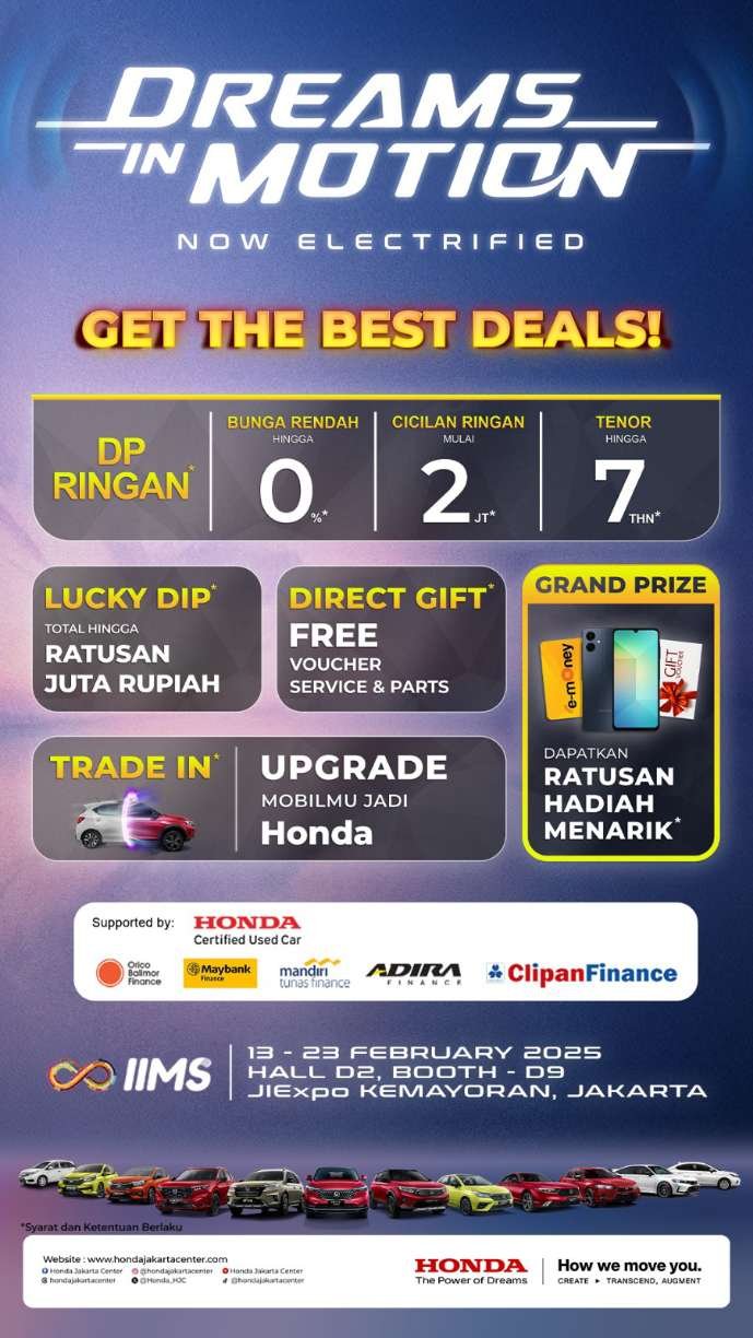 Honda menghadirkan program penjualan atraktif yang bertajuk “Get The Best Deals”*. Program penjualan unggulan Honda di IIMS 2025 mulai dari program bunga mulai dari 0%, cicilan ringan mulai dari Rp 2 Juta, program DP ringan*, tenor hingga 7 Tahun*, Lucky Dip dengan total hingga ratusan juta Rupiah, Free Voucher Service dan Parts, Grand Prize ratusan hadiah serta program Trade In. Selain itu, Honda juga menyediakan kesempatan bagi pengunjung untuk mencoba langsung mobil Honda melalui sesi test drive termasuk mobil listrik Honda, yaitu Honda e:N1, Honda HR-V, dan Honda WR-V.