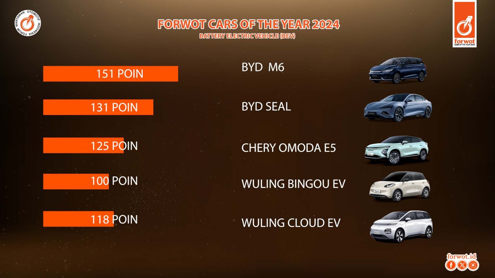 Sama seperti liga HEV, kemenangan rookie pun terjadi di liga BEV. BYD M6 mengungguli 4 finalis yang diluncurkan lebih dulu di pasar Indonesia. MPV dari BYD ini menggondol 151 point. BYD Seal dengan 131 point menempati posisi kedua. Posisi ketiga diduduki oleh Chery Omoda E5 (125). Dua model mobil listrik dari Wuling Motors, Cloud EV (118) dan Binguo EV (100) harus puas di posisi keempat dan kelima.