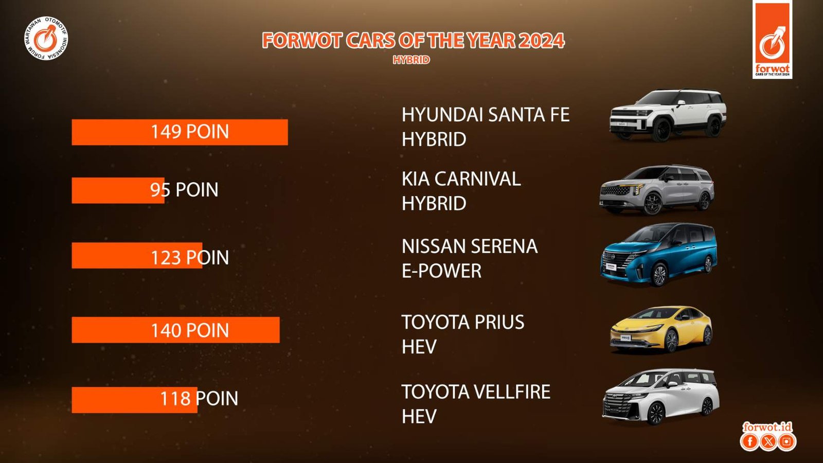 Pendatang baru Hyundai Santa Fe Hybrid, yang diluncurkan pada Oktober 2024, paling sukses memikat para juri dengan membawa predikat Mobil Hybrid Terbaik 2024. Generasi kelima SUV Hyundai ini memeroleh nilai 149, mengalahkan Toyota Prius HEV (140), Nissan Serena e-POWER (123), Toyota Vellfire HEV (118), dan Kia Carnival HEV (95).