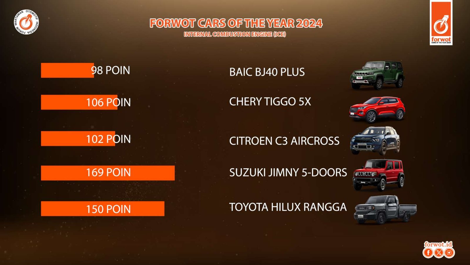Kategori Mobil Internal Combustion Engine (ICE) dimenangkan oleh Suzuki Jimny 5-doors. Panel juri yang terdiri dari 25 wartawan bidang otomotif berpengalaman memberikan SUV 4×4 legendaris Suzuki ini nilai 169. Posisi kedua diraih oleh Toyota Rangga dengan perolehan nilai 150. Sedangkan posisi ketiga, keempat dan kelima, masing-masing ditempati oleh Chery Tiggo 5X (106), Citroen C3 Aircross (102), dan BAIC BJ40 Plus (98).