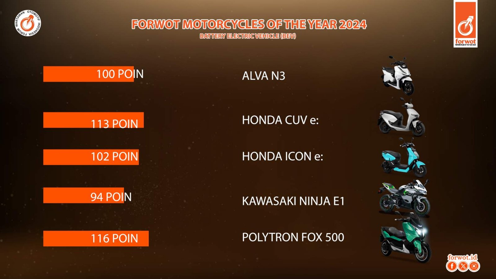 Sedangkan untuk Forwot Motorcycle of the Year 2024 menampilkan 2 kategori yakni ICE dan BEV. Panel juri terdiri dari 23 jurnalis berpengalaman dari berbagai media.
