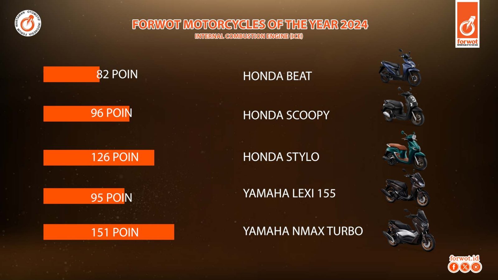 Yamaha NMax dengan 151 point berhasil menjinakkan laju Honda Stylo 160 (126), Honda Scoopy (96), Yamaha Lexi 155 (95), dan Honda BeAT (82).