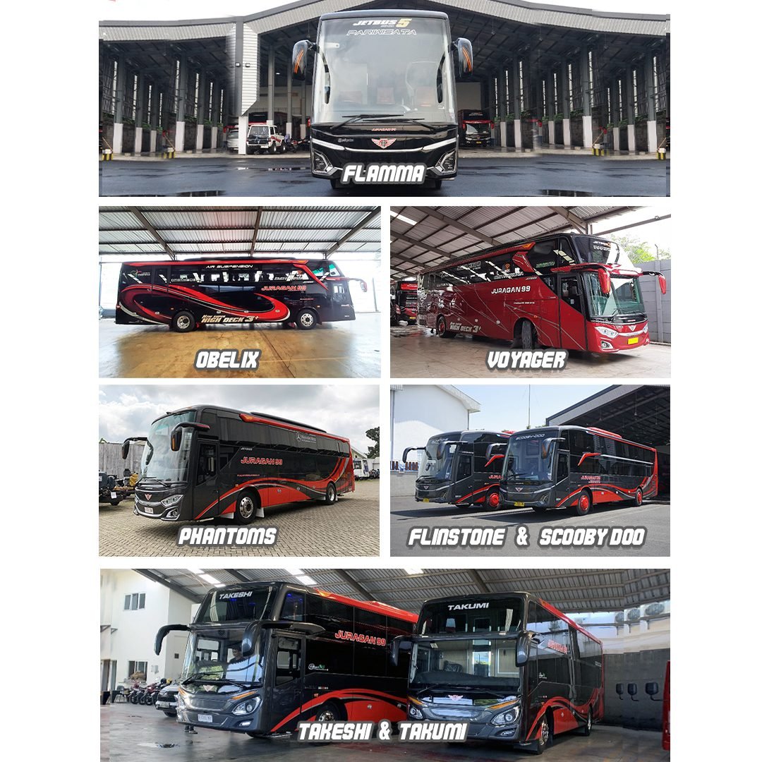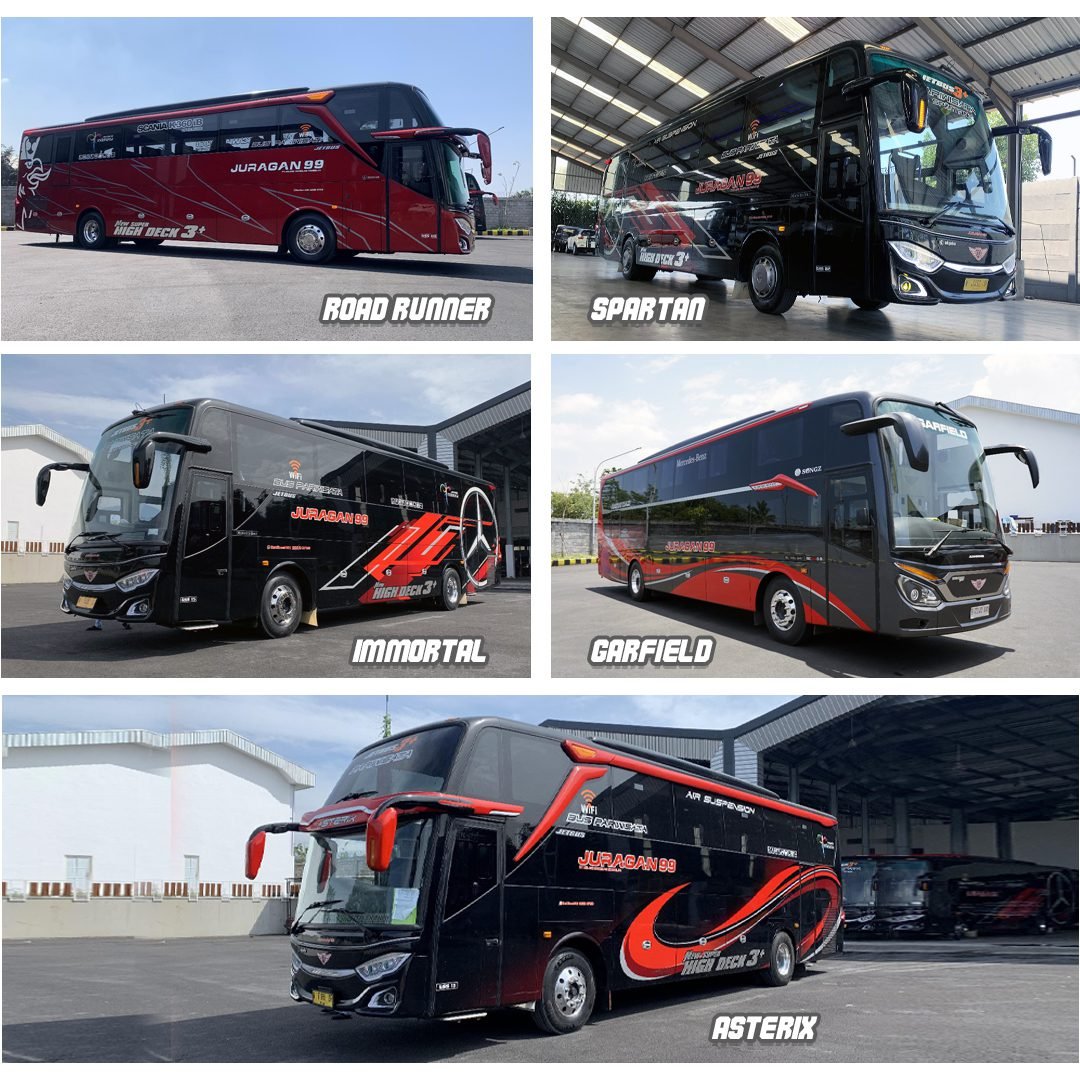 Lantas apa saja nama-nama bus Juragan 99 Trans saat ini? Irfan menuturkan, “Pelanggan setia Juragan 99 Trans pastinya sudah tidak asing lagi mendengar nama-nama bus kami. Untuk AKAP rute Malang – Jakarta – Malang, ada bus Simpsons, Phantoms, Gundam, Gavan, Garfield, dan Casper. Untuk rute Malang – Denpasar – Malang, ada Takeshi dan Takumi. Selain bus-bus AKAP tersebut, ada juga bus wisata yang bernama Asterix, Concorde, Eleanor, Immortal, Flamma, Heimdall, McQueen, Obelix, Road Runner, Spartan, Wolverine, Kobochan, Scooby Doo, Flintstone, dan Omah Sultan. Sedangkan dua armada terbaru Juragan 99 Trans yang merupakan bus double decker dengan kursi penumpang full sleeper pertama di Indonesia diberi nama Tweety dan Goofy.”