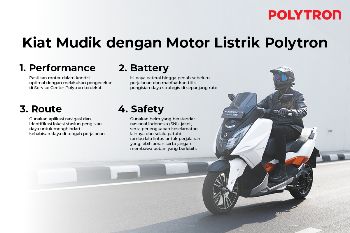 Mudik dengan motor listrik Polytron bisa menjadi pengalaman yang menyenangkan dan efisien jika dipersiapkan dengan baik. Polytron juga memiliki fasilitas fast charging station di beberapa lokasi showroom Polytron. Fasilitas ini dapat digunakan secara gratis oleh para pemudik yang menggunakan motor listrik Polytron. Informasi mengenai titik fast charging Polytron dapat diakses melalui aplikasi Polytron EV atau melalui tautan berikut https://polytronev.id/location.