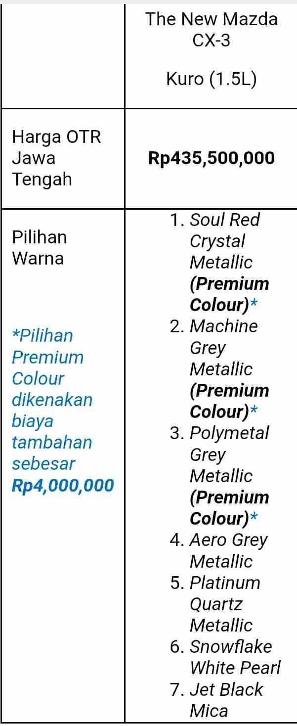 The New Mazda CX-3 Kuro ditawarkan dengan harga OTR Jawa Tengah Rp435,500,000.