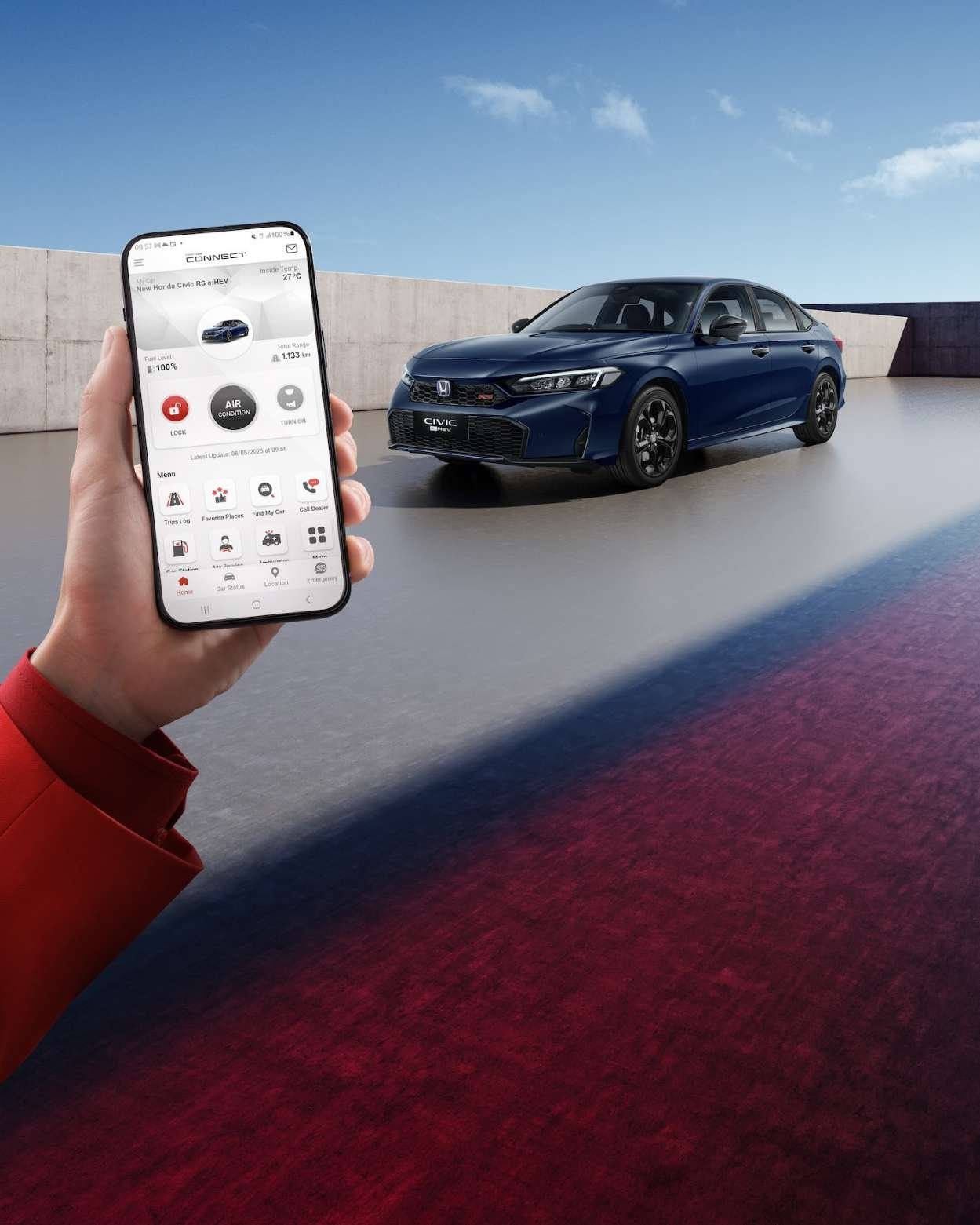 New Honda Civic RS e:HEV dilengkapi dengan teknologi konektivitas canggih melalui sistem Honda CONNECT, yang memungkinkan pengguna terhubung dengan kendaraan secara real-time menggunakan aplikasi di smartphone. Melalui fitur ini, pengguna dapat mengontrol berbagai fungsi kendaraan dari jarak jauh seperti menyalakan atau mematikan mesin, mengatur AC, mengunci dan membuka pintu, hingga menyalakan lampu, cukup melalui genggaman tangan.