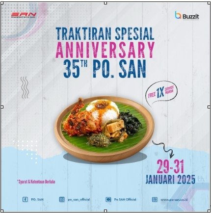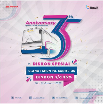 Program apresiasi HUT PO SAN untuk konsumen terbagi menjadi tiga bagian. Pertama, khusus pada tanggal 30 Januari 2025, PO SAN memberikan diskon harga tiket hingga 35% untuk semua rute perjalanan. Diskon ini berlaku untuk penumpang yang membeli tiket PO SAN di Buzzit atau di agen resmi penjualan tiket.
