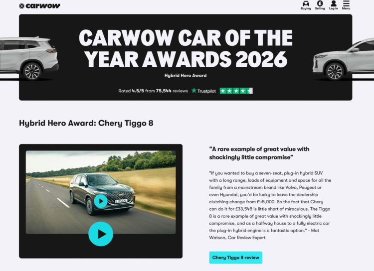 Penghargaan tersebut merupakan hasil evaluasi objektif Carwow dan dukungan langsung dari Editor-in-Chief mereka, Mat Watson, yang memberikan penilaian tinggi terhadap kualitas dan value-for-money TIGGO 8. Mat Watson menilai SUV ini menawarkan pengalaman premium, fitur lengkap, serta harga yang jauh lebih kompetitif dibandingkan model Eropa sekelasnya. Dari 42 model yang diuji sepanjang tahun, TIGGO 8 menjadi satu dari hanya enam kendaraan yang masuk daftar rekomendasi “Buy” oleh Mat Watson. Hal ini merupakan prestasi yang sebelumnya hanya dicapai oleh merek-merek mewah terkemuka.