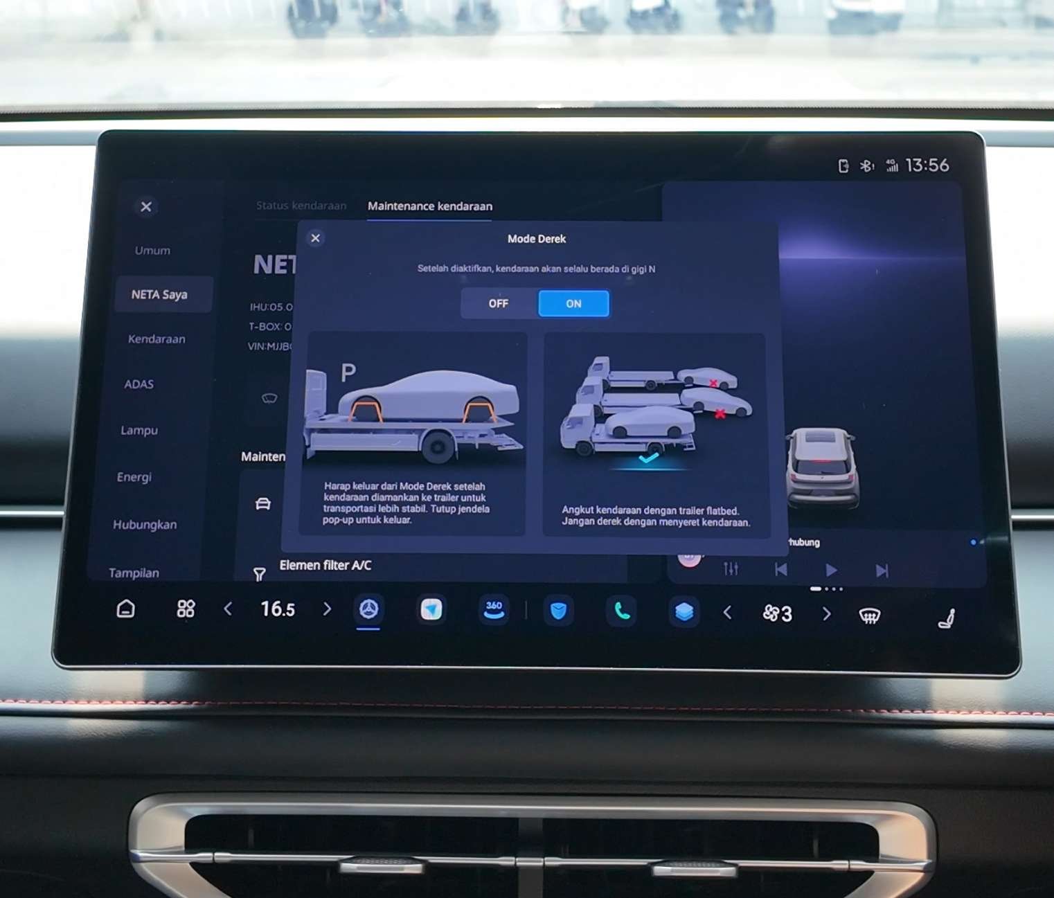 Pada Head Unit NETA X, pilih menu pengaturan, lalu lanjut pilih menu NETA Saya, lalu kemudian ada pilihan Status Kendaraan dan Maintenance Kendaraan, dan pilih yang Maintenance Kendaraan, dan terdapat Mode Derek, jika di bahasa inggris muncul dengan Towing Mode, lalu pilih atau klik Mode Derek tersebut, lalu akan muncul keterangan setelah diaktifkan, kendaraan akan selalu berada di transmisi N atau Netral, dan muncul juga pilihan OFF dan ON untuk mengaktifkan Mode Derek tersebut. Setelah itu, sambil menginjak pedal rem tekan tombol ON pada layar Head Unit NETA X. Jika sudah berhasil, Terdapat indikator transmisi yang akan berubah menjadi [N] atau NETRAL di Digital Instrument Cluster NETA X.